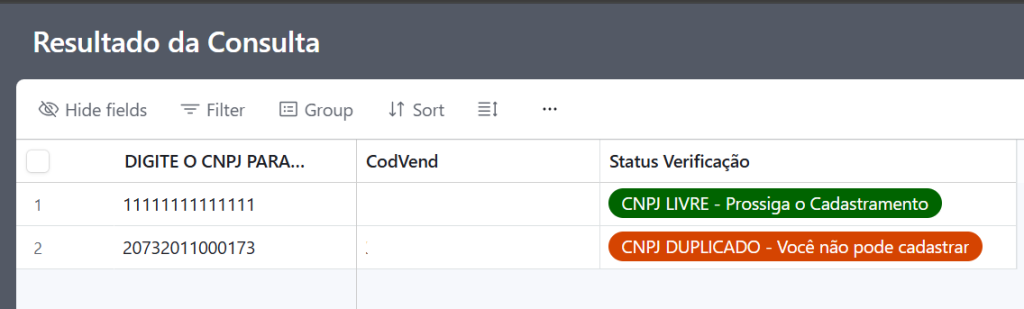 - Se o CNPJ consultado já estiver na base, aparecerá uma mensagem vermelha impedindo o cadastramento.
